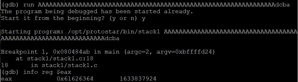 그 후 info reg &eax를 확인하니 찾는 것인 0x61626364가 나오는 것을 확인할 수 있다.