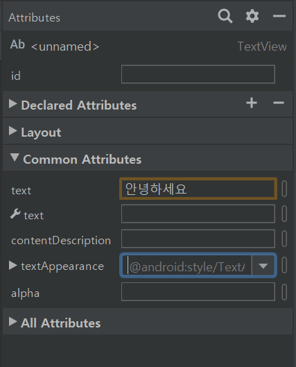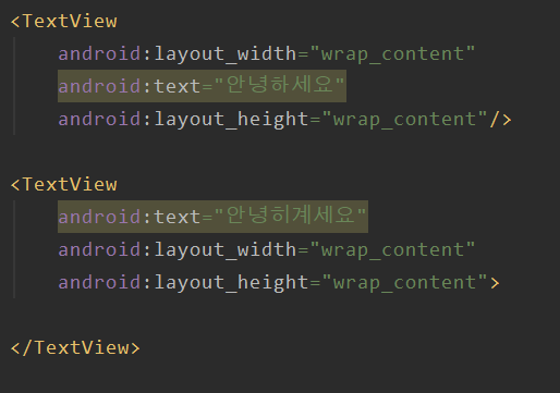 그냥 text 글자만 입력하면 자동으로 이렇게 android : text = ""가 설정되어서 나온다.
