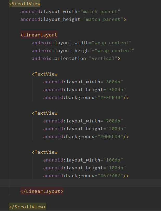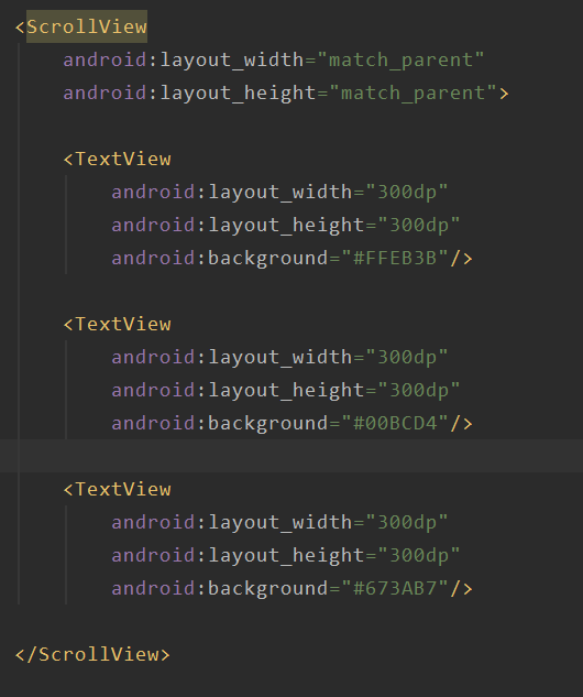 그래서 ScrollView에서 LinearLayout을 자식 하나로 가지는 형태로 바꿔주어야 한다.