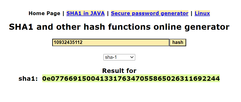 그래서 우선 1093245112를 sha1로 돌렸더니 다음과 같은 값이 나왔다.